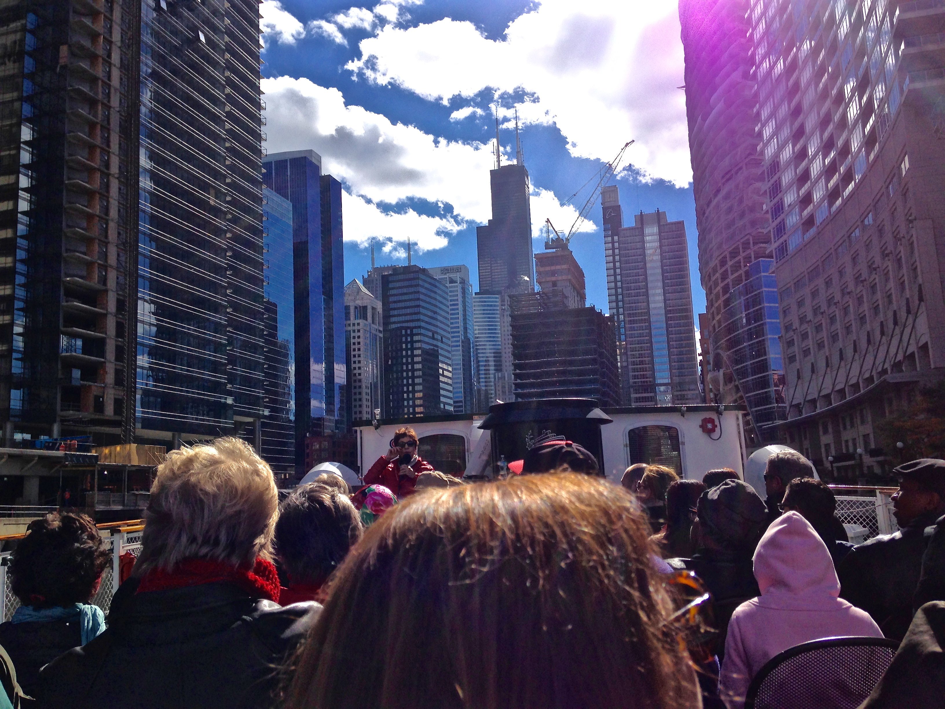 With the weather continuing to treat us well–cooler today, but sparkling blue skies–more of us went of to take the Architectural Boat Tour, run by the Architecture Society. This is a remarkable way to see the city. The boat travels up the Chicago River, then off onto two different branches, then back down to the Navy Pier. The views are spectacular from start to finish, and our guide was enormously knowledgeable. Each of us who has taken the tour has come back raving about it, and with good cause.